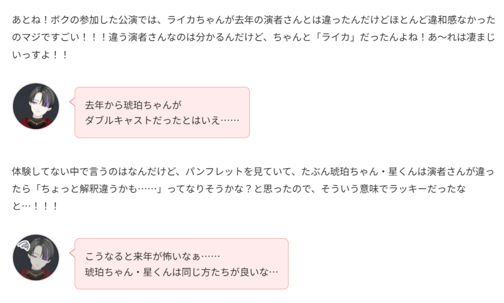 いま一番怖いのはココかな!!ネタバレなし記事で書いたんだけど、2作目「ムーンリット☆ナイト」では主役のライカちゃん・琥珀ちゃん・星くんの3人がそれぞれダブルキャストだったんですよね!そんな中、しっかり琥珀ちゃんと星くんは1作目と同じ演者さんを引き当てることが出来たと…!!!